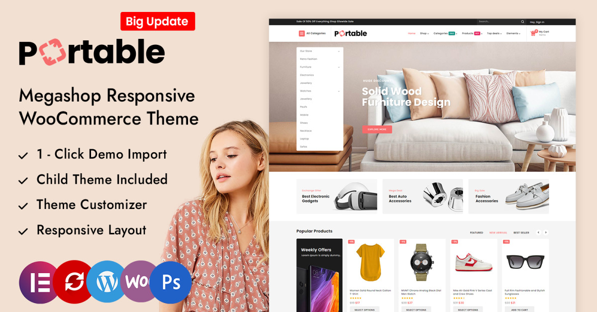 "Portable" es un tema de WordPress versátil y rico en funciones diseñado específicamente para crear megatiendas en línea potentes y visualmente impresionantes. El tema cuenta con un diseño espacioso y dinámico optimizado para mostrar una amplia gama de productos en varias categorías. Como puedo decir, el tema es adecuado para todo tipo de productos, como tiendas de moda, artículos electrónicos, gadgets, muebles, joyas, productos de decoración del hogar y otros accesorios. Su diseño de mega tienda garantiza que sus productos se exhiban de manera atractiva y organizada, mejorando la participación de los usuarios y las ventas.