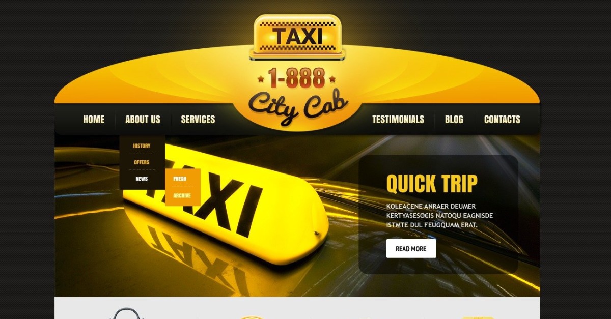 El elemento skeuomorphism es una parte notable del diseño de la plantilla. Lo primero que vería un visitante es una señal de taxi en la cabina. La plantilla incluye el color amarillo tradicional para taxi delineado por un fondo negro. La originalidad del aspecto haría que el sitio web fuera reconocible desarrollando el proceso de marca.