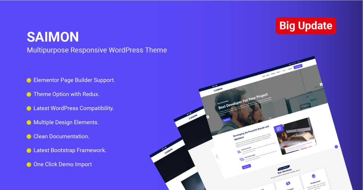 Saimon es el tema más hermoso y receptivo para cualquier tipo de proyecto de sitio web. Siempre admitimos la última versión de WordPress. Por eso Saimon es el tema más seguro para tu proyecto. Da vida a las ideas de tu sitio web con un hermoso tema de WordPress. Personalice fácilmente su sitio web visualmente y vea los cambios al instante con Elementor Page Builder . No se requiere codificación.