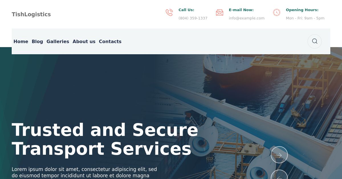 TishLogistics incluye un banner de página de inicio de héroe para representar un contenido de inicio de su negocio de logística y transporte. El contenido se puede personalizar fácilmente desde el Panel de administración - Menú izquierdo - Apariencia - Personalizar - sección 'Control deslizante'.