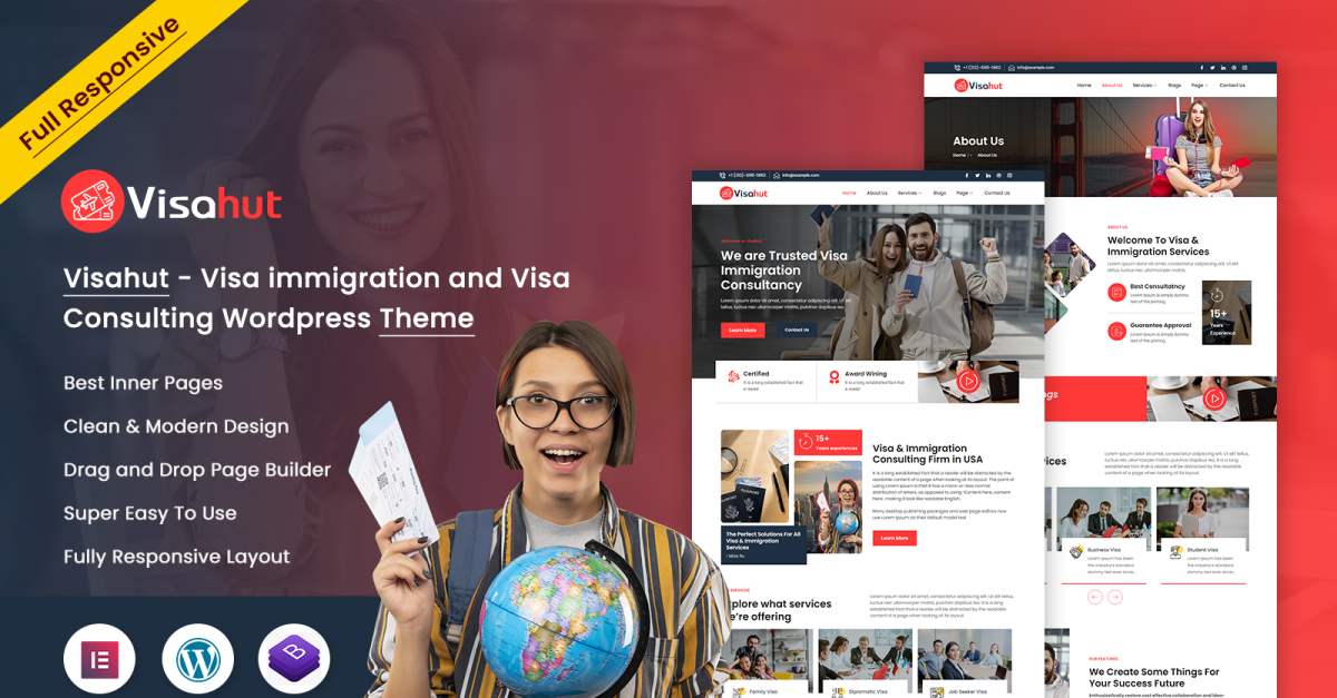 Descubra Visahut, el tema de WordPress para Visa Immigration and Visa Consulting. Visahut puede ser su puerta de entrada al desarrollo fluido de sitios web para todas las necesidades relacionadas con visas. Diseñado a medida para desarrolladores, individuos y empresas, este tema fácil de usar ofrece un poderoso conjunto de herramientas y características para crear sin esfuerzo un sitio web atractivo y profesional. Con plantillas prediseñadas y opciones de personalización, muestre los servicios de visas, la experiencia en inmigración y las soluciones de consultoría de una manera visualmente impresionante. Atraiga a su audiencia con elementos interactivos, navegación fluida y diseño responsivo, garantizando una experiencia de usuario perfecta en todos los dispositivos. ¡Desbloquee posibilidades ilimitadas y aumente su presencia en línea con este tema, haciendo que su sitio web de visas e inmigración sea un éxito instantáneo!