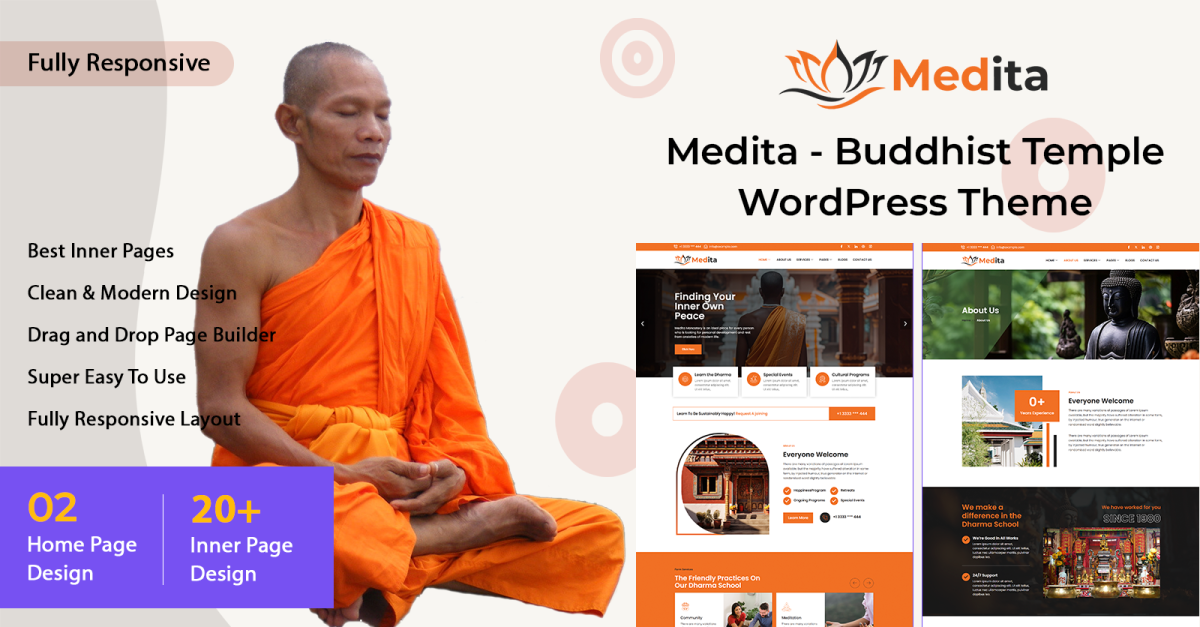 Medita es un tema de WordPress sereno y elegante diseñado específicamente para templos budistas, centros de meditación y comunidades espirituales. Este tema ofrece secciones listas para usar para mostrar eventos, enseñanzas, servicios comunitarios y opciones de donación, lo que lo ayuda a conectarse con sus seguidores sin esfuerzo. Su diseño tranquilo y su navegación sencilla crean un espacio en línea acogedor para los visitantes. Medita es totalmente personalizable y compatible con dispositivos móviles, lo que le permite crear un sitio web único y atractivo que refleje sus valores. Con Medita, puede atraer nuevos miembros, compartir sus enseñanzas y fortalecer su comunidad espiritual en línea con facilidad.