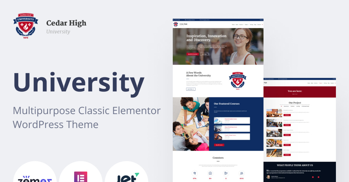 Con el tema universitario de WordPress Cedar High, hemos combinado a la perfección un diseño impactante, una funcionalidad excepcional y una personalización sencilla. Este innovador producto está diseñado específicamente para el sector educativo, lo que lo convierte en la opción ideal para universidades, profesores particulares, bibliotecas e instituciones de formación profesional. Destaca y muestra el talento de tu institución educativa con Cedar High.