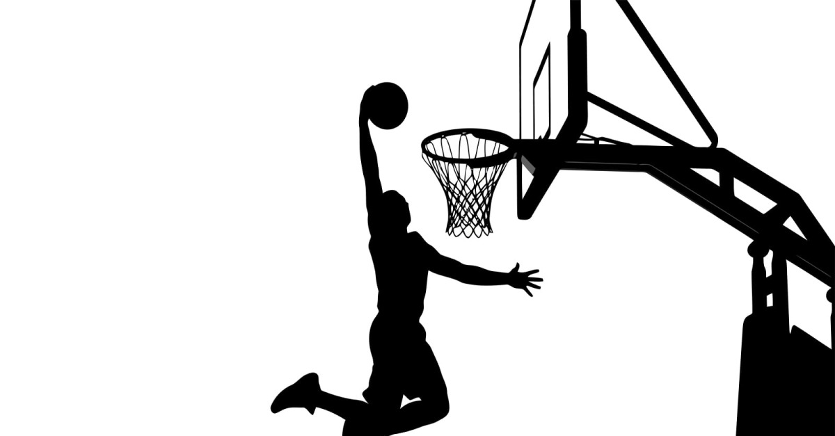 Silueta dinámica de un atleta ejecutando un potente mate de baloncesto aislado sobre fondo blanco 8 € Descargue