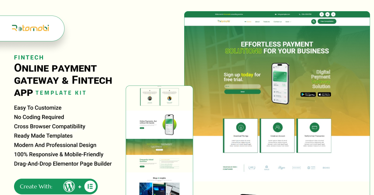 Rotomobi – Passerelle de paiement en ligne et kit de modèles Fintech Elementor