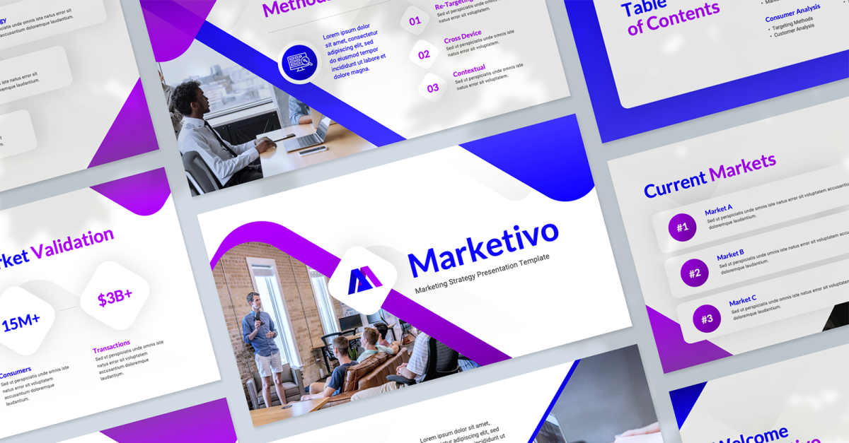 Lors de la création du modèle de présentation Marketivo, nous avons ciblé les marketeurs, les agences marketing, les analystes de marché et les startups. Que vous présentiez une offre à un nouveau client important ou un portefeuille d'activités, ce modèle Google Slides vous permettra de transformer vos informations et données en présentation rapidement et efficacement.