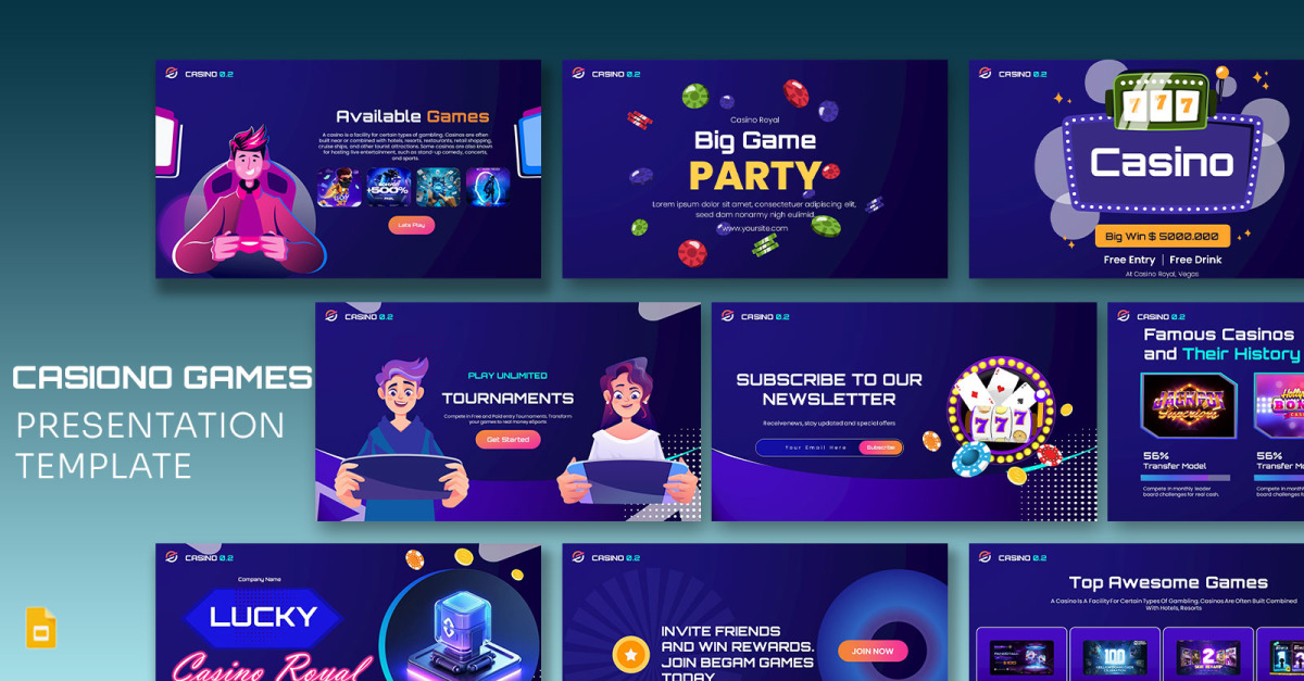 - Visuels dynamiques : graphiques de haute qualité présentant des éléments de casino tels que des jetons de poker, des cartes, des dés, des machines à sous, des roulettes et des accents dorés ou néon luxueux.
