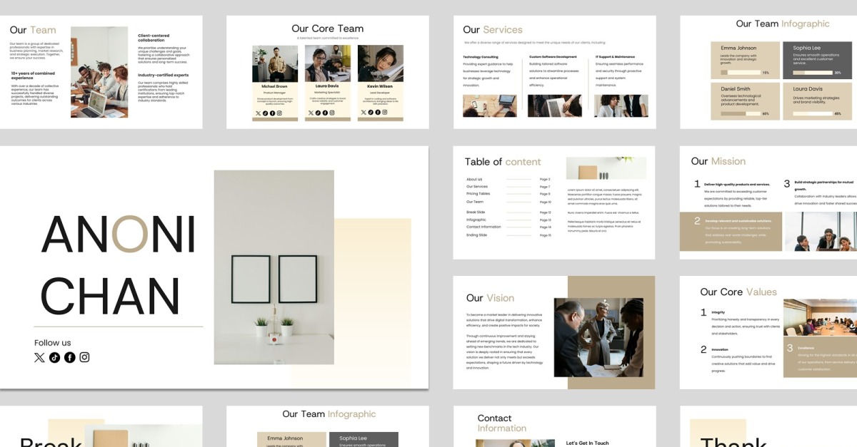Anonichan - Profil de l'entreprise La présentation GoogleSlide est conçue pour être intuitive et élégante. Elle comprend diverses infographies telles que des graphiques à barres, des graphiques circulaires, des graphiques linéaires et bien plus encore, ce qui en fait une solution polyvalente pour toute présentation.