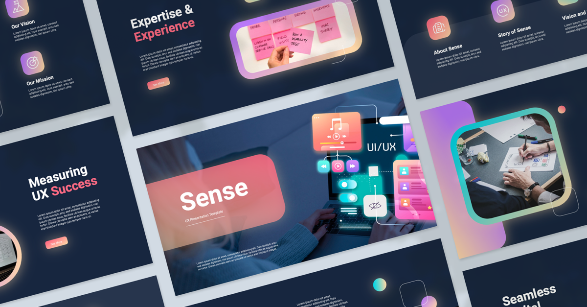 Lors de la création du modèle de présentation Sense, nous avons ciblé en priorité les concepteurs d'expérience utilisateur (UX), les chefs de produit, les développeurs web, les chercheurs UX et les designers numériques. Que vous présentiez une offre à un nouveau client important ou un portfolio d'entreprise, ce modèle Google Slides vous permettra de transformer vos informations et données en présentation rapidement et efficacement.