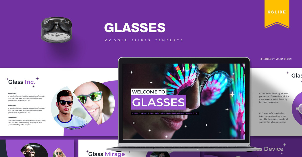 C'est **Lunettes | Modèle Google Slides ** - Obtenez-le maintenant !, un excellent modèle Google Slides pour tous les besoins professionnels ou personnels.