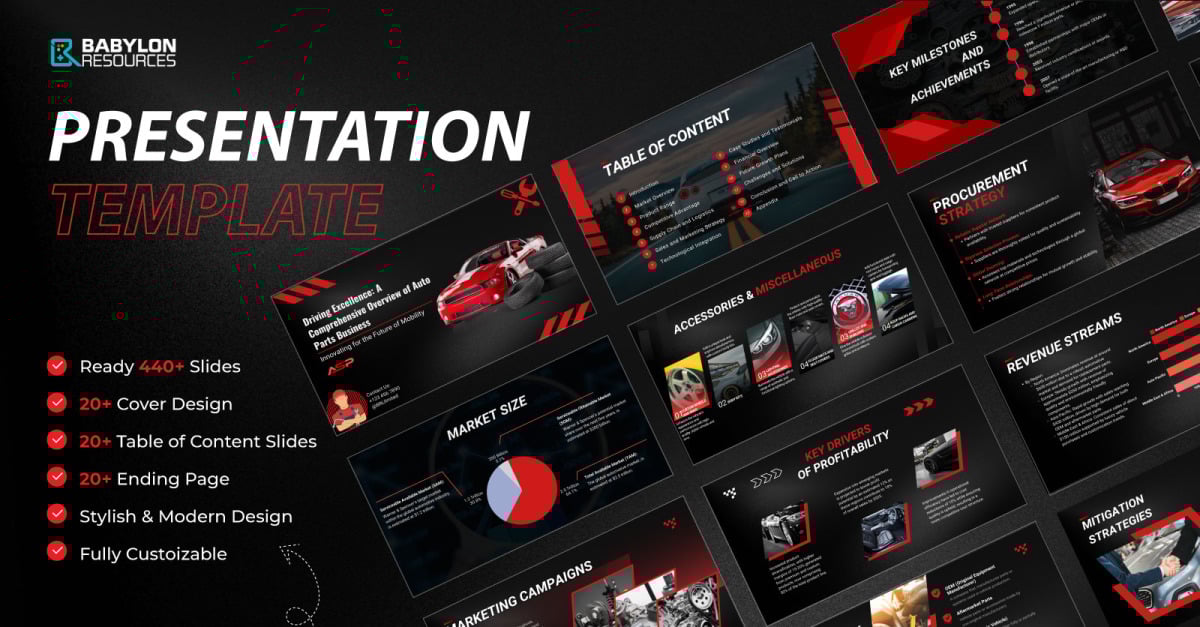 - Plus de 450 diapositives de haute qualité – Couvrant tous les aspects du secteur des pièces automobiles et de l’industrie automobile.