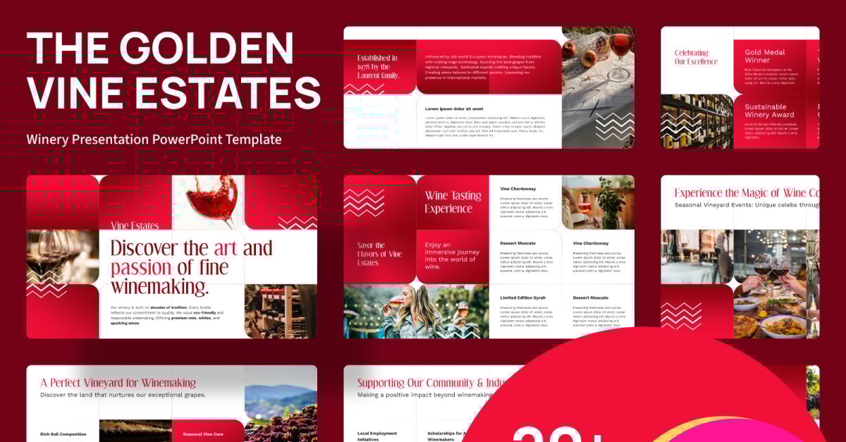 Sublimez votre récit avec la présentation du domaine viticole VINE ESTATES , un modèle PowerPoint alliant élégance et dynamisme. Imaginez un décor aux tons rouges dégradés, immortalisant les couchers de soleil sur les vignobles, tandis que les motifs ondulés et les grilles rectangulaires arrondies ajoutent une touche rythmique et organique. Son design allie modernité et charme intemporel. Avec 20 diapositives soigneusement conçues au format 16:9, il offre une adaptabilité optimale : changez les couleurs, remplacez les images et personnalisez le texte en toute simplicité. Laissez libre cours à votre créativité : téléchargez-le dès maintenant et laissez libre cours à votre imagination !