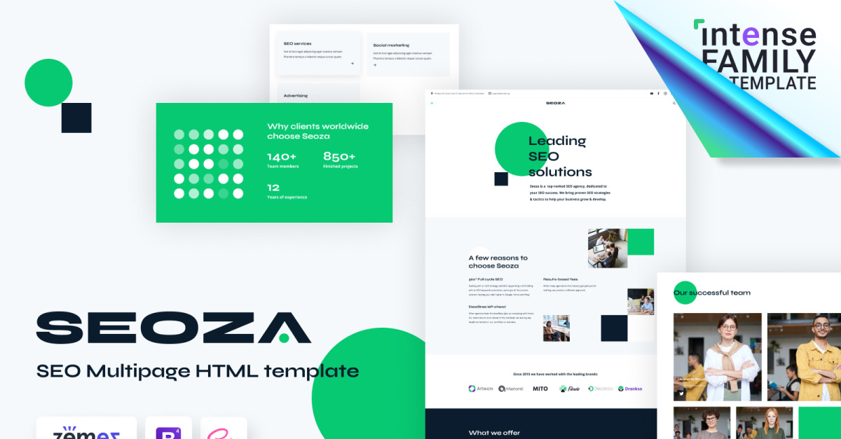 Cette solution fait également partie de la famille de modèles Intense. Il offre un grand choix de modèles enfants et un large éventail de sujets. De plus, tous les modèles inclus dans le package de modèles Intense peuvent être achetés à un prix abordable. Néanmoins, notre modèle de site Web HTML pour agence de référencement peut vous offrir de nombreuses opportunités, même seul. Par exemple, avec des transitions impressionnantes et des animations CSS3, vous rendrez facilement votre site Web plus impressionnant.