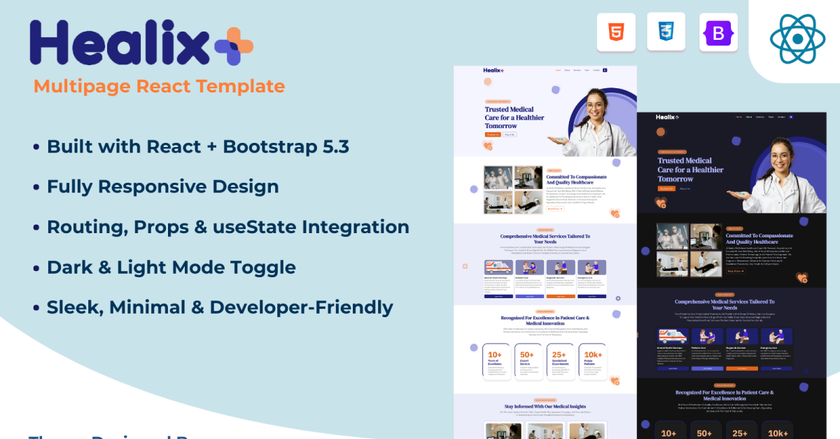 Healix est un modèle React professionnel et moderne pour le secteur de la santé, conçu avec soin pour les hôpitaux, les cliniques, les médecins, les professionnels de santé, les centres de santé, les pharmacies et les sites web dédiés au bien-être. Doté d'un design épuré et contemporain, il garantit confiance et professionnalisme tout en offrant des fonctionnalités robustes telles que des mises en page réactives, des composants réutilisables, des modes clair et sombre et des structures multipages. C'est la solution idéale pour créer une présence en ligne fiable et percutante.