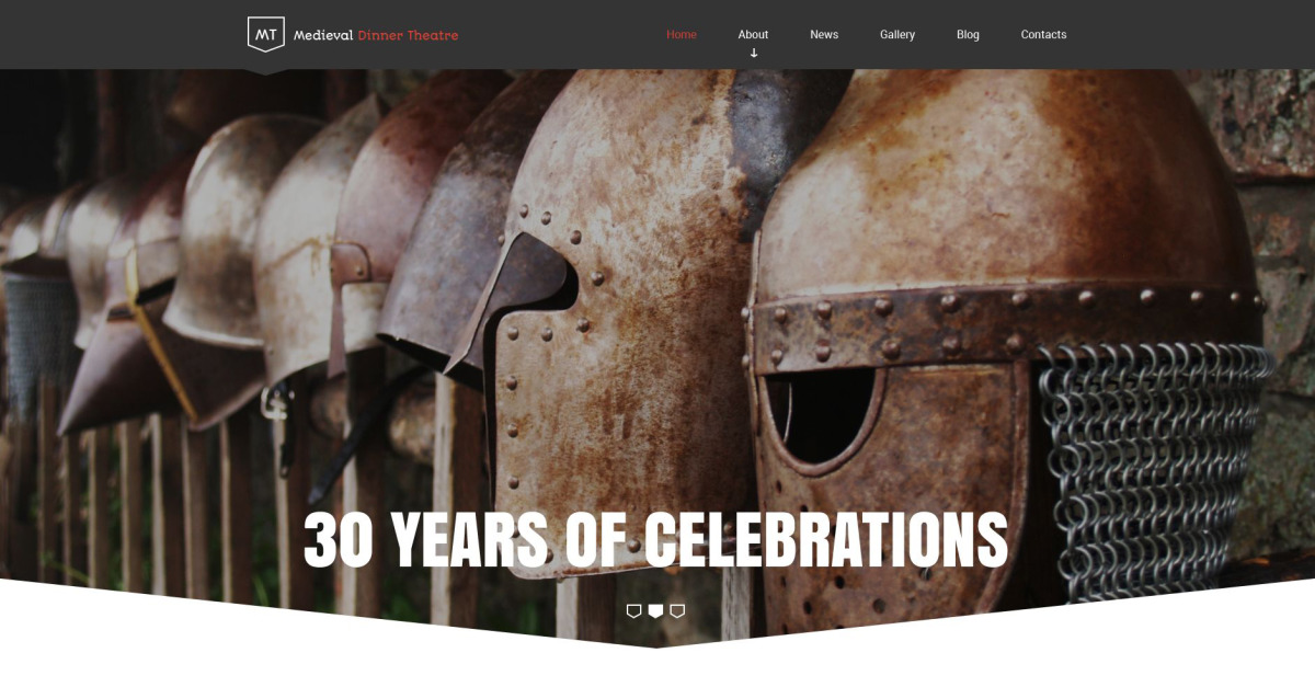 Dites aux gens qu'ils peuvent non seulement dîner dans votre restaurant, mais aussi assister à une véritable joute, comme les rois et les reines au moyen-âge. Notre auteur a réussi à faire correspondre deux époques sur une seule page Web. Le curseur présente des scènes du passé, de l'époque où les chevaliers se battaient pour le cœur des charmantes dames. En dessous se trouve la partie contemporaine du modèle avec une énorme typographie, des icônes sommaires, une navigation par onglets, des photos haute résolution et les cartes Google intégrées en bas, indiquant le chemin vers ce magnifique château, un dîner-théâtre médiéval.