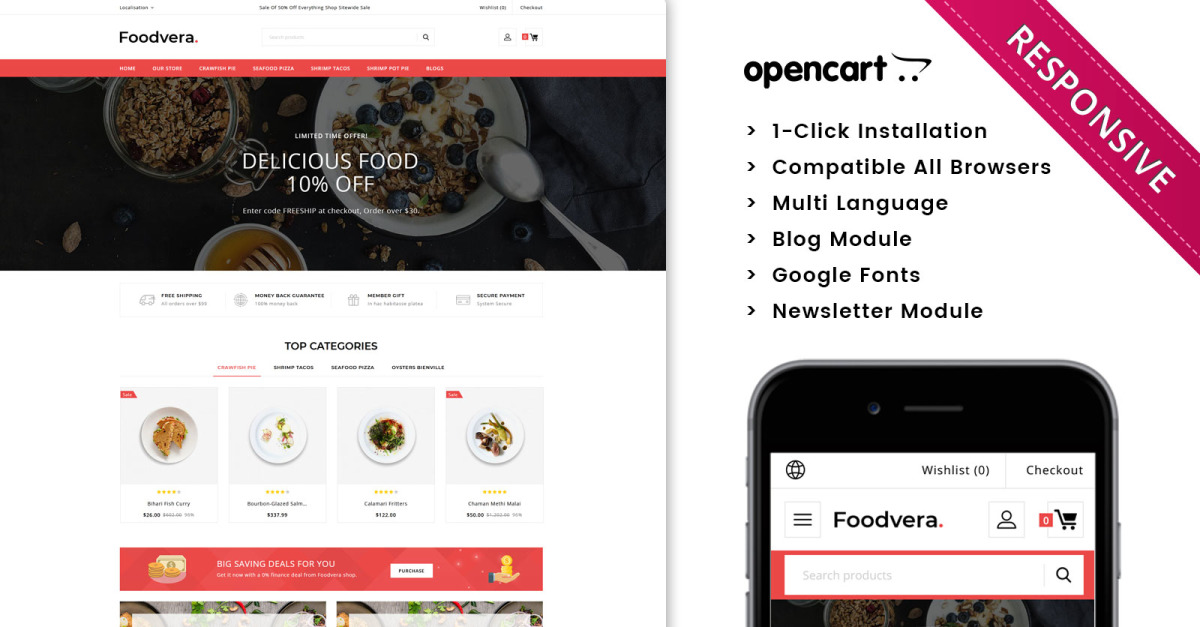 Présentation de Foodvera – Le modèle réactif Opencart pour les magasins de restauration rapide et de restauration , une mise en page méticuleusement conçue conçue pour élever votre entreprise culinaire en ligne. Conçu pour un large éventail de délices gastronomiques, notamment les pizzas, les cuisines italienne et mexicaine, les saveurs délicieuses, les fast-foods, les pizzerias, les cafés, les hamburgers, les fruits de mer, Gusto, les plats biologiques, les restaurants, les boulangeries, les bars, les boissons et bien plus encore , Foodvera est le thème par excellence pour une boutique en ligne polyvalente.