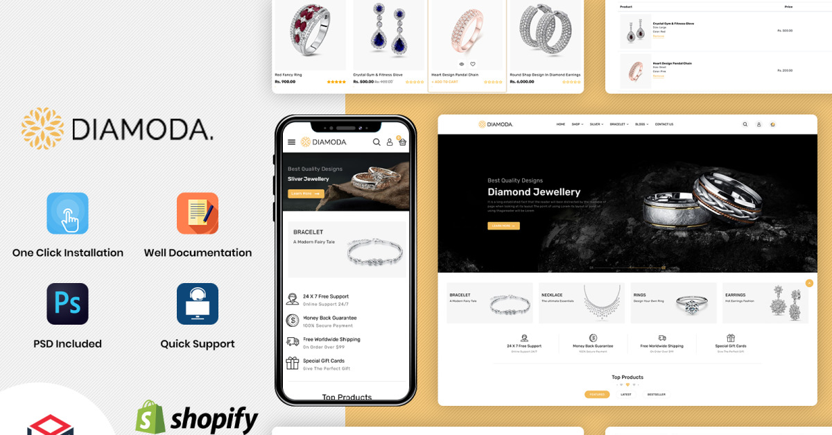 Diamoda - thème shopify le plus réactif pour les bijoux et accessoires. diamoda est très simple à utiliser, tout le monde peut l'utiliser sans connaissances en codage ou sans embaucher un développeur. n'importe qui peut facilement le modifier et le contrôler. développez votre entreprise avec diamoda, devenez propriétaire du meilleur site Web de conception, obtenez le meilleur classement en matière de conception et attirez les acheteurs. ce thème est très célèbre car tout le contenu de chaque page est bien conçu et toutes les pages sont uniques, en particulier la page d'accueil est au design très épuré et moderne. vendez vos produits en ligne sans aucune restriction et sur un site Web attrayant, le visiteur peut facilement trouver les produits dont il a besoin car la recherche est la priorité pour trouver n'importe quoi en quelques secondes. charger le site Web plus rapidement, optimisé pour le référencement.