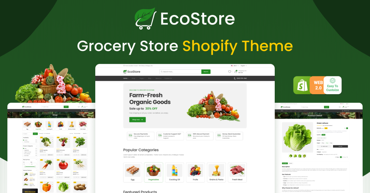 Le thème Shopify EcoStore - Fresh Organic Food and Grocery Store est un thème moderne et écologique conçu pour les entreprises vendant des aliments biologiques, des produits d'épicerie et des produits durables. Avec un design épuré qui met l'accent sur l'esthétique naturelle, EcoStore vous permet de créer une expérience d'achat en ligne attrayante et conviviale. Conçu spécifiquement pour les épiceries et les marchés d'aliments biologiques, il offre des mises en page flexibles, un filtrage avancé des produits et une intégration transparente de Shopify. Parfait pour les entreprises soucieuses de l'environnement, ce thème est optimisé pour les appareils mobiles et offre une expérience d'achat rapide et fluide tout en soulignant l'engagement de votre marque en faveur du développement durable. L'aspect épuré et minimaliste d'EcoStore met vos produits au premier plan, ce qui permet aux clients de parcourir facilement les fruits frais, les légumes et autres produits d'épicerie biologiques.