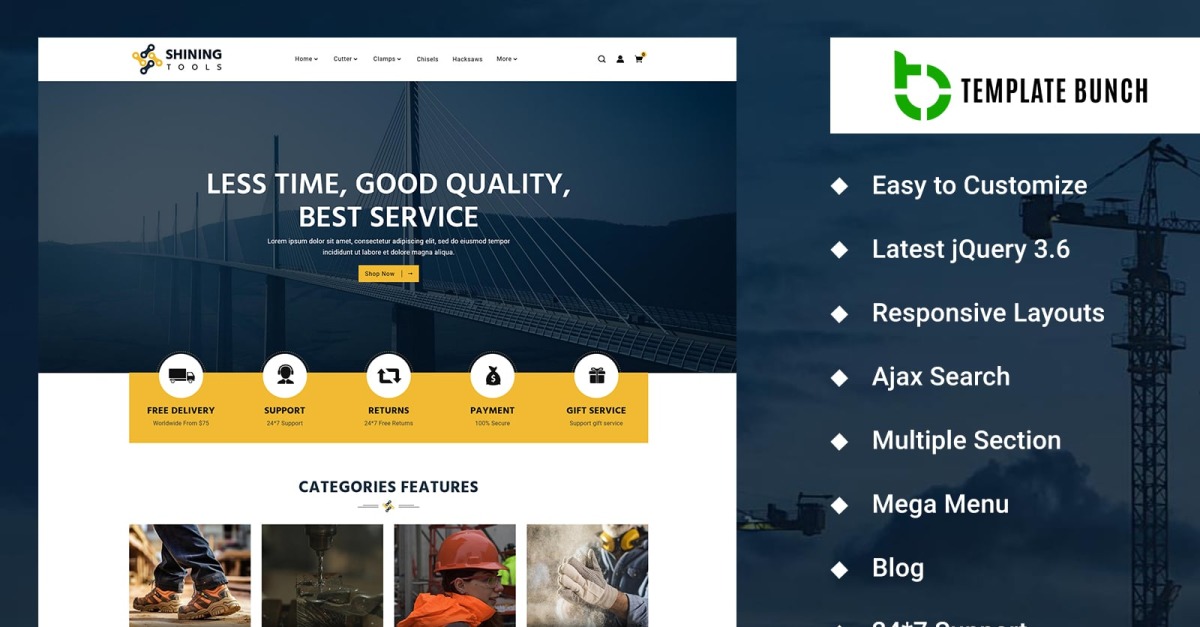 Bénéficiant d'un support 24h/24 et 7j/7, Shining - Tools eCommerce Theme on Shopify Website Template est la solution ultime pour créer une boutique en ligne riche en fonctionnalités, visuellement époustouflante et facile à gérer pour votre entreprise d'outils et de matériel.