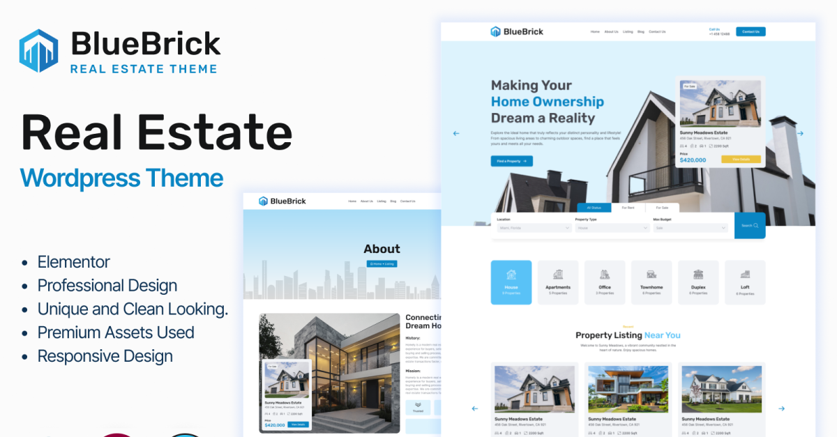 Bluebrick est bien plus qu'un thème : c'est une solution immobilière intelligente pour les entreprises immobilières modernes. Elle allie fonctionnalité et esthétique pour vous aider à créer un site web qui inspire confiance, promeut vos annonces et génère des prospects. Que vous lanciez une entreprise immobilière ou renouveliez un ancien site web, Bluebrick vous offre les outils nécessaires pour évoluer et réussir dans l'immobilier numérique.