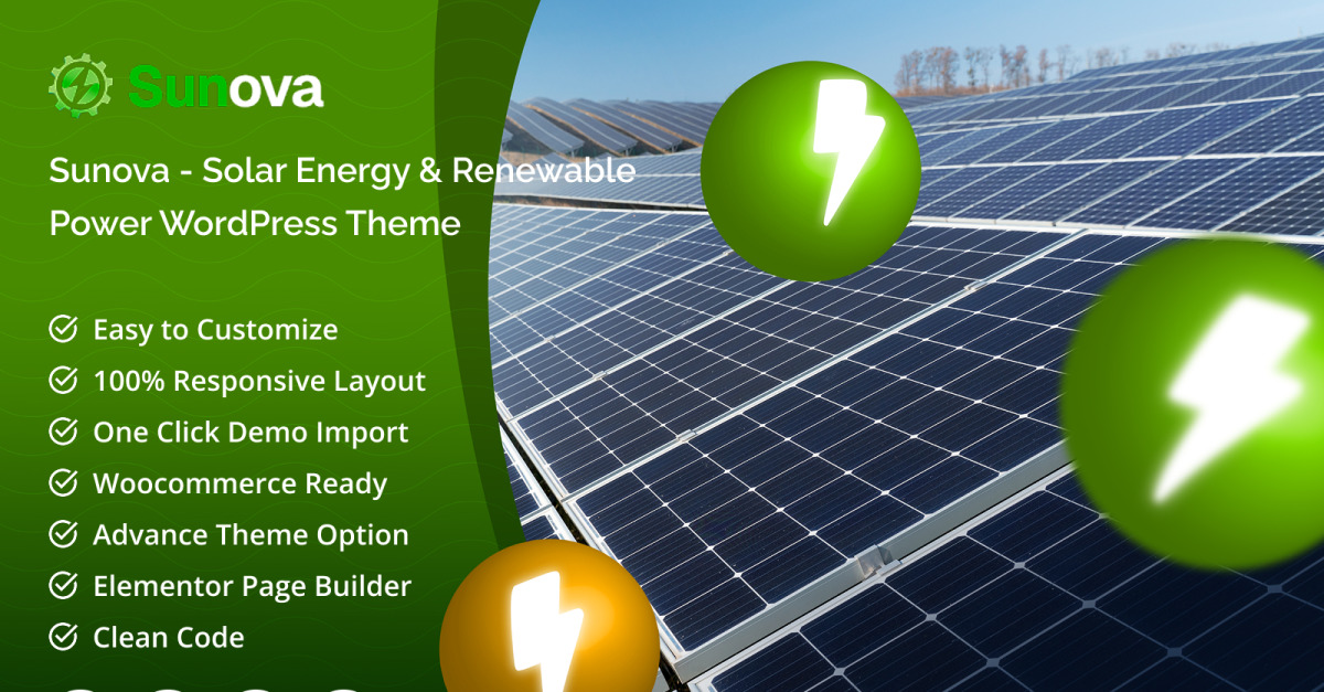 Sunova est un thème WordPress épuré, moderne et entièrement responsive, conçu pour les entreprises d'énergie solaire, les services d'énergie renouvelable, les entreprises éco-responsables et les fournisseurs d'énergie durable. Que vous proposiez l'installation de panneaux solaires, des solutions d'énergie éolienne ou tout autre service d'énergie verte, Sunova vous aide à créer un site web professionnel qui inspire confiance et attire les clients.