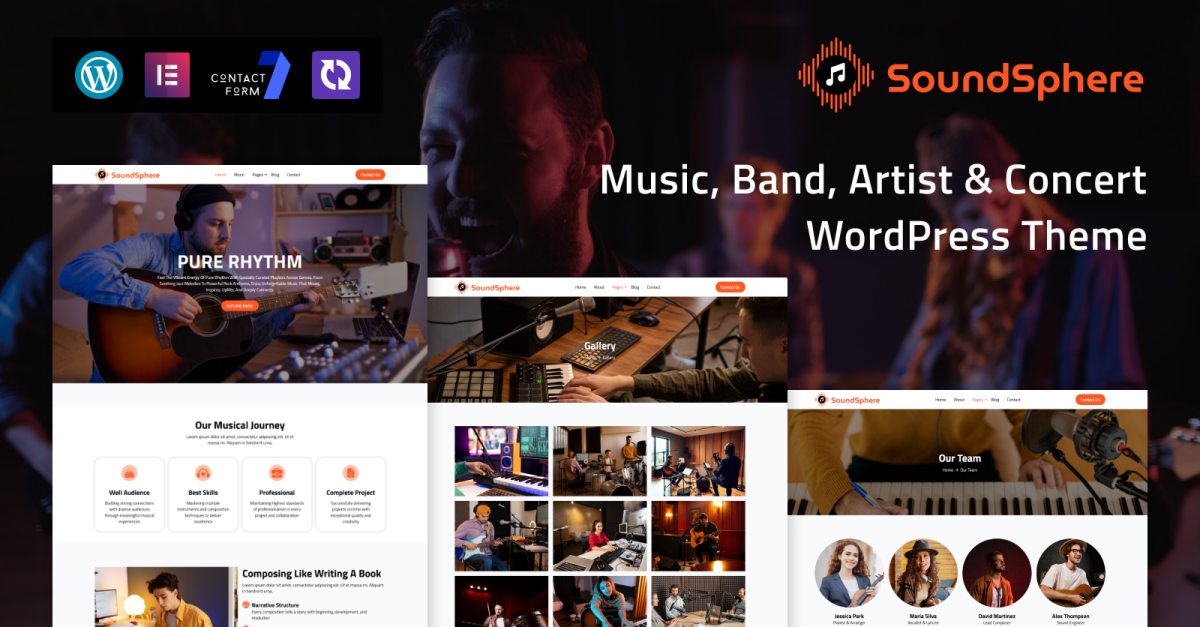 SoundSphere est un thème WordPress élégant et dynamique dédié à la musique et aux groupes, développé avec Elementor et conçu pour les musiciens, artistes, groupes, DJ, organisateurs de concerts, écoles de musique et studios d'enregistrement. Grâce à ses designs modernes et ses fonctionnalités performantes, SoundSphere vous permet de créer une présence en ligne exceptionnelle qui vous permettra de toucher vos fans et de promouvoir votre parcours musical.