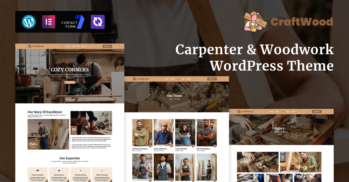 CraftWood est un thème WordPress moderne et élégant, spécialement conçu pour les menuisiers, ébénistes et artisans. Avec sa mise en page épurée, ses visuels attrayants et ses options de personnalisation faciles, ce thème vous permet de mettre en valeur votre savoir-faire, vos services et vos projets.