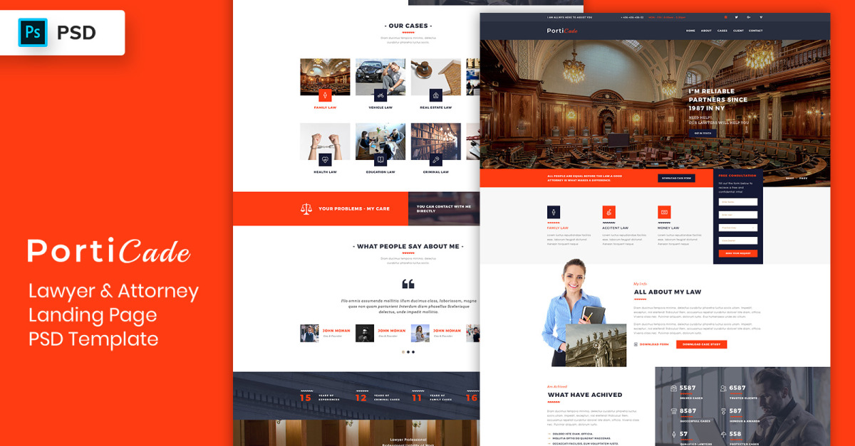 Éléments de l'interface utilisateur du modèle PSD de la page de destination de l'avocat et de l'avocat