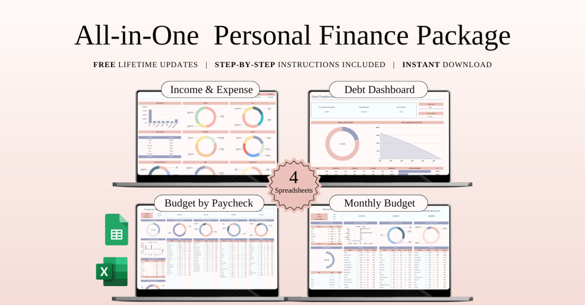 Mindent egyben tartalmazó személyes pénzügyi csomag | Táblázatsablonok Excelhez és Google Táblázatokhoz