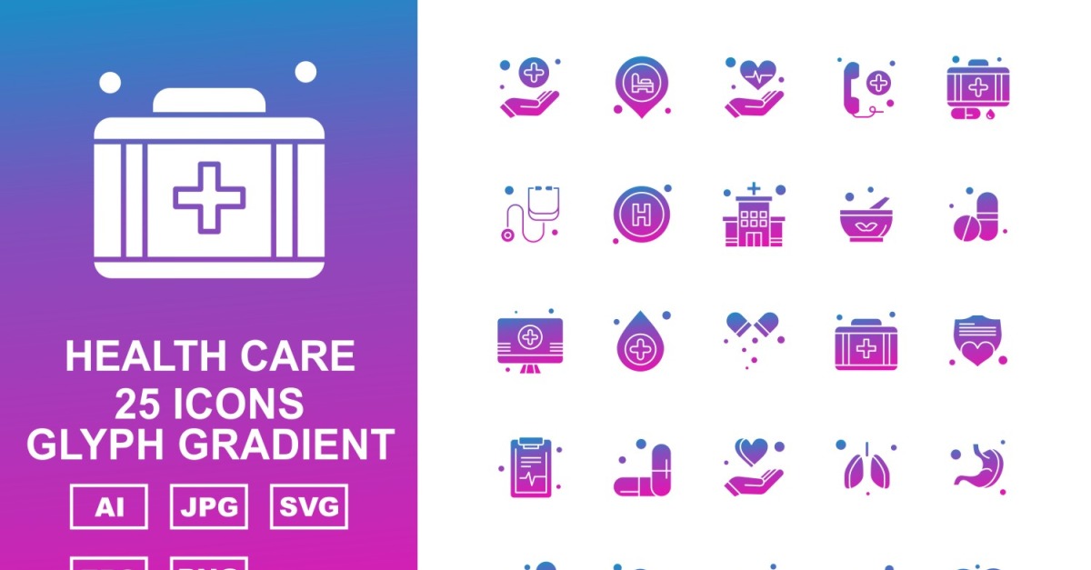 Download this premium 25 Premium Health Care Glyph Gradient Icon Set published on TemplateMonster.
