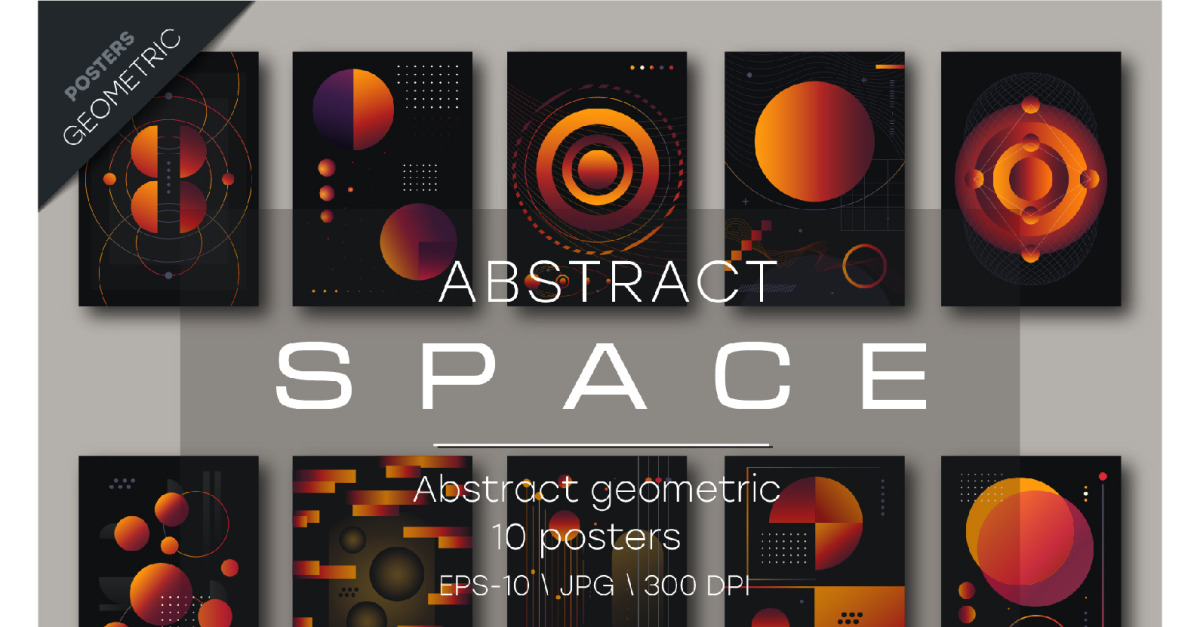 10 Abstract Futuristic Posters with mystical elements, planets, gradient shapes on a black background. Esoteric symbols, imitation planets. Vector.