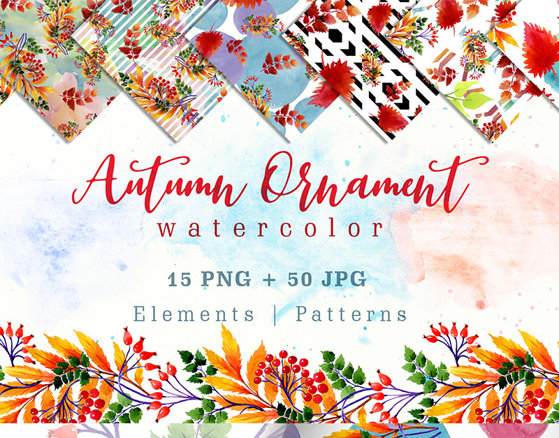 Autumn ornament of leaves and red berries watercolor set of 65 files. Ideal material for DIY, wedding invitations, bed linen, greeting cards, quotes, blogs, posters and more.