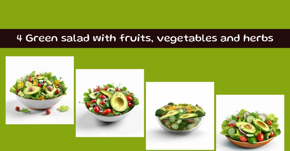 Green salad with fruits, vegetables and herbs. Enjoy the art of cooked with our dish and food products AI images. Perfect for food menus, recipe books, or culinary-themed designs, social media post, banner and etc. it adds a touch of artisanal charm to your creative projects.