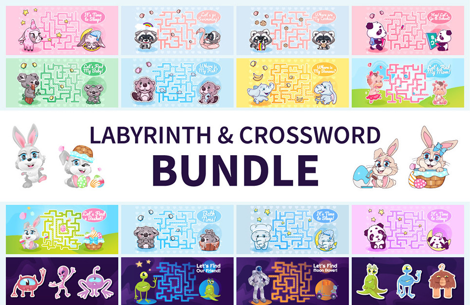 This bundle contains 1 aliens character stickers set, 15 labyrinths templates with cartoon animals, spaceman and aliens characters, 1 space themed crossword template and 3 cute Easter bunnies kawaii cartoon vector characters sets. You can edit these templates and use them in your design!