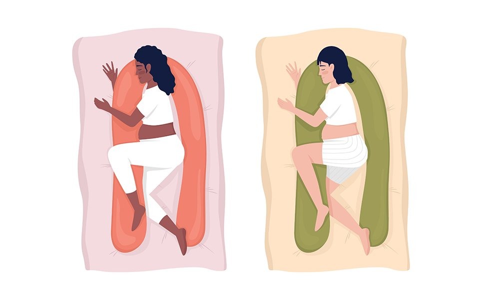 Sleeping with pregnancy pillow 2D vector isolated illustration set. Expecting mothers flat characters on cartoon background. Colourful editable scene collection for mobile, website, presentation