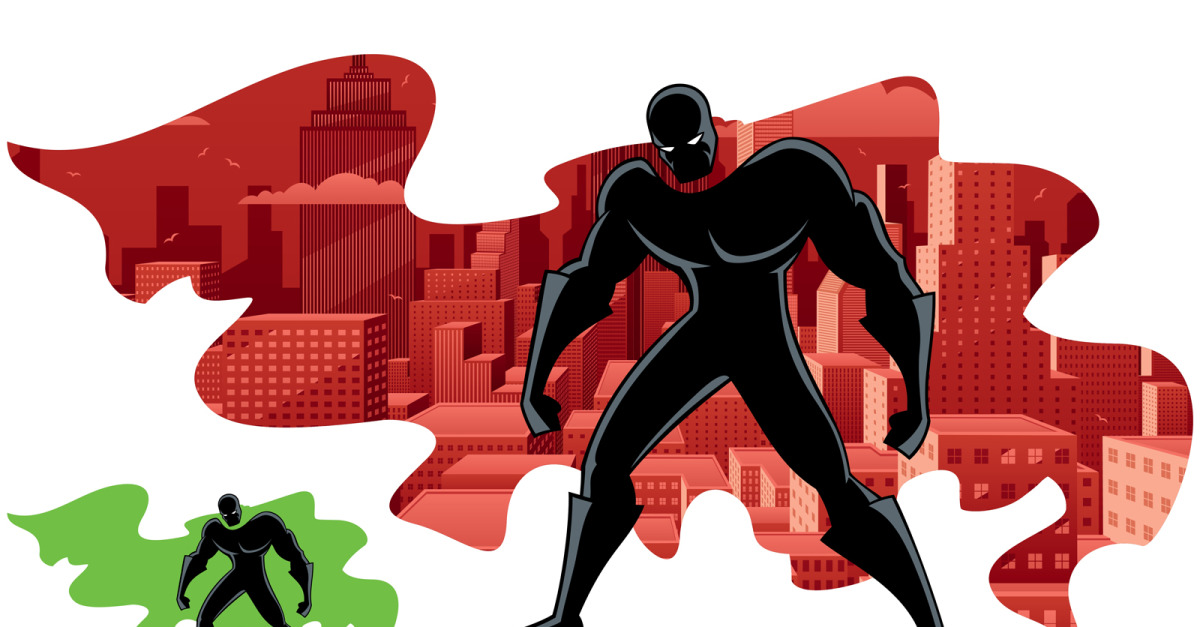 Abstract illustration of superhero and city. No transparency used. Basic (linear) gradients. Version with green cape for custom double exposure included.