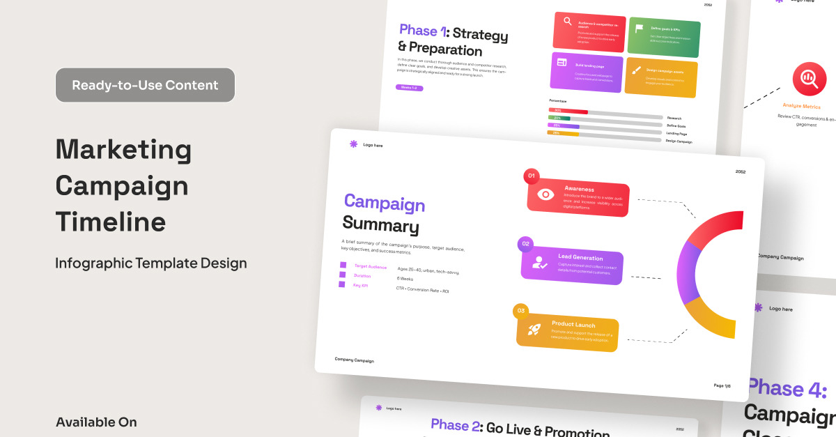 Showcase your marketing performance and project evolution through this clean infographic presentation. Built with a balanced mix of typography and graphic hierarchy, it delivers a professional way to communicate strategy, milestones, and outcomes for digital campaigns.