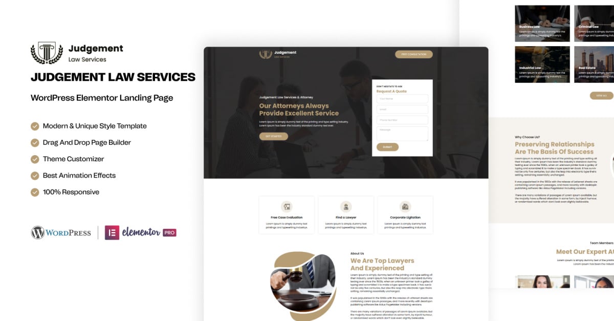 Giudizio – Modello Elementor pronto all'uso per servizi legali WordPress
