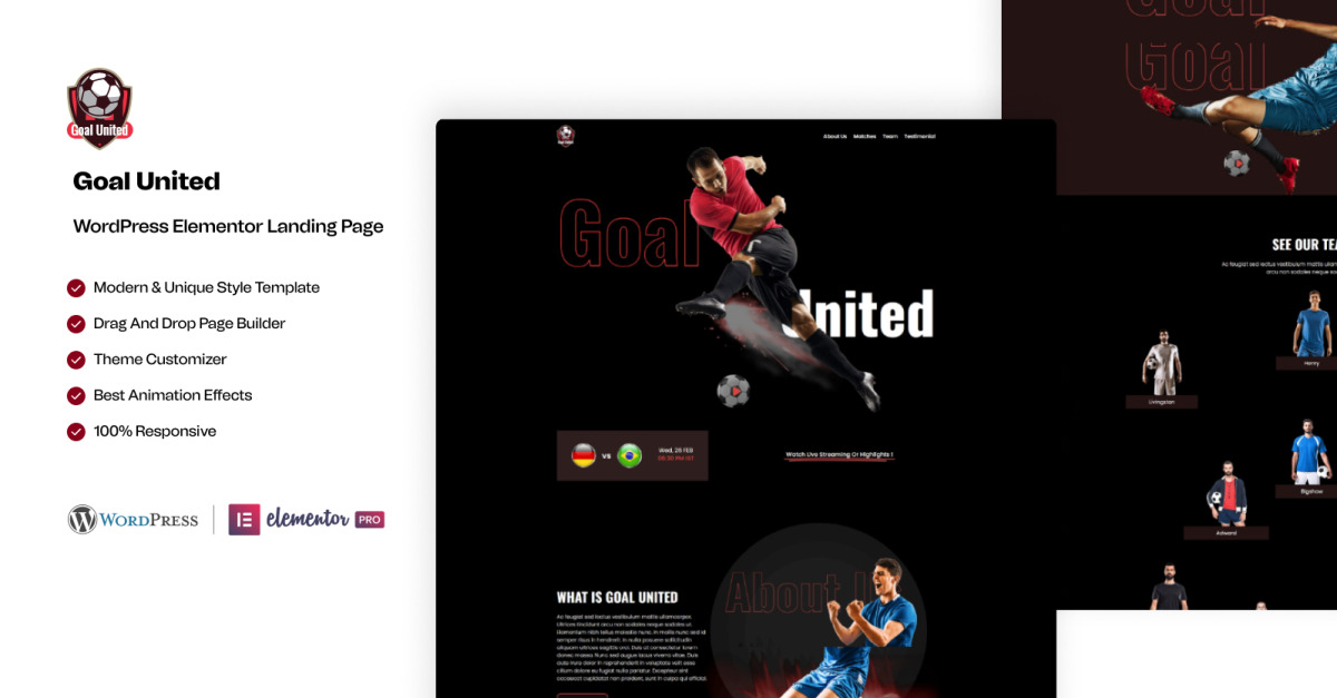 Goal United – Modello di landing page per Elementor dedicato allo sport calcistico su WordPress