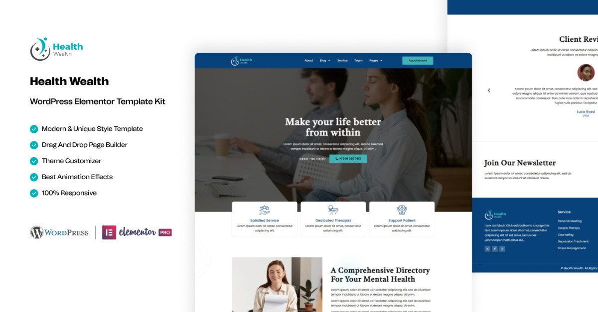 Kit modello WordPress Elementor per servizi di assistenza sanitaria e benessere