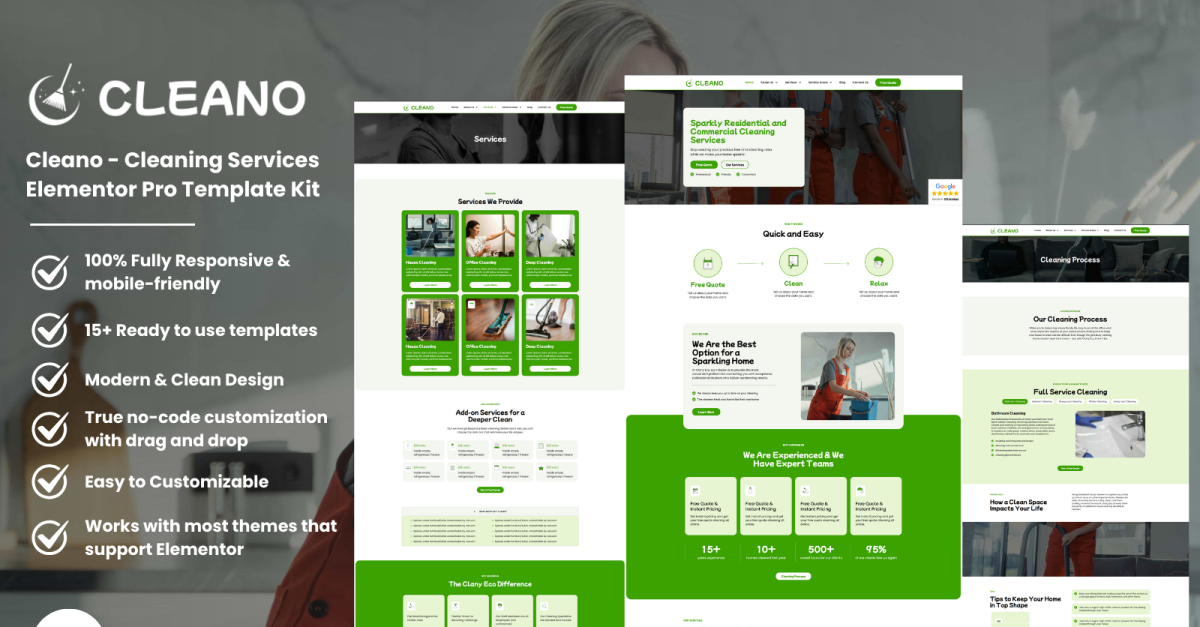 Cleano - Kit modello Elementor Pro per servizi di pulizia