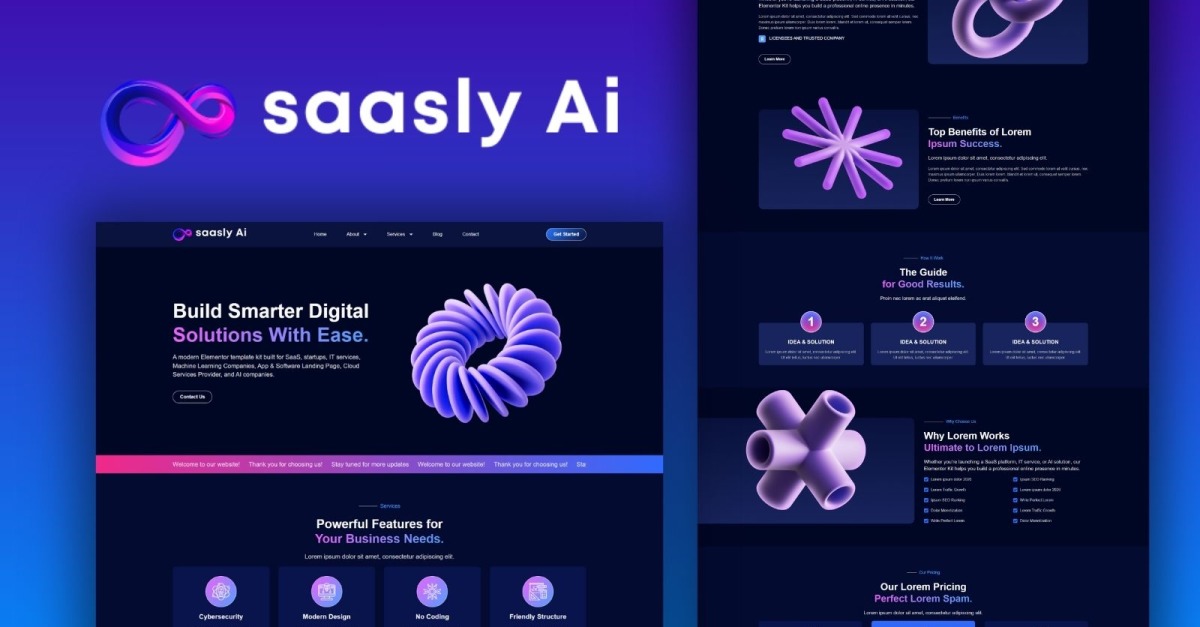 Saasly AI – Kit di modelli Elementor per aziende moderne SaaS, tecnologia, intelligenza artificiale e startup
