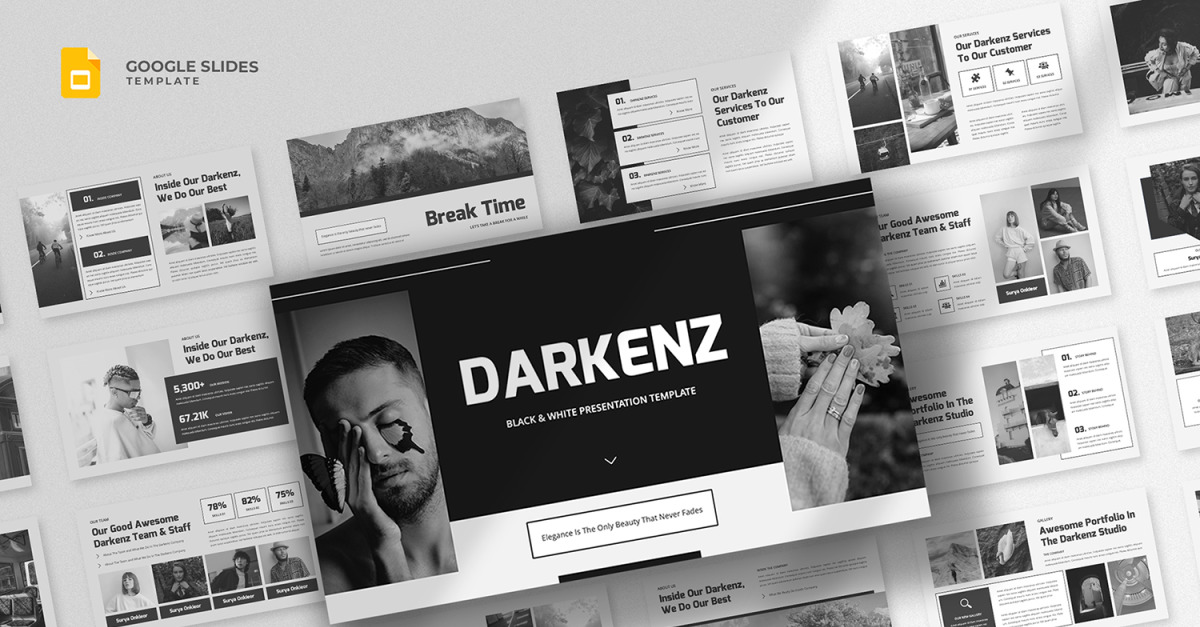 Darkenz - Modello di Presentazioni Google in bianco e nero