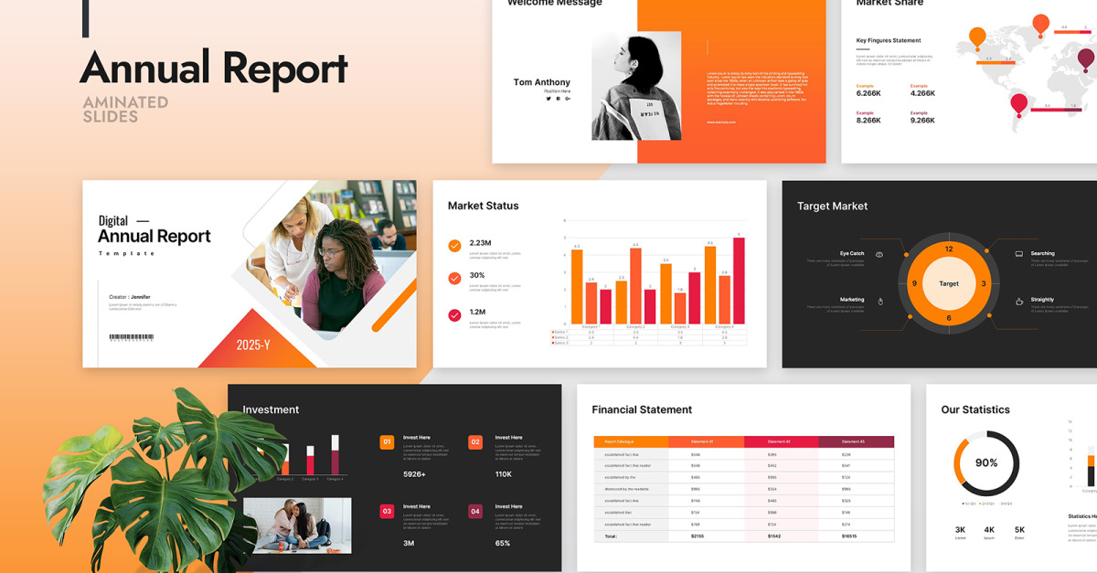 Annual Report Google Slide Layout ti consente di aggiungere semplicemente il tuo logo e le immagini e modificare i colori e la tipografia del tuo marchio e sei pronto per partire. Non perdere tempo, abbiamo fatto tutto il duro lavoro per te.