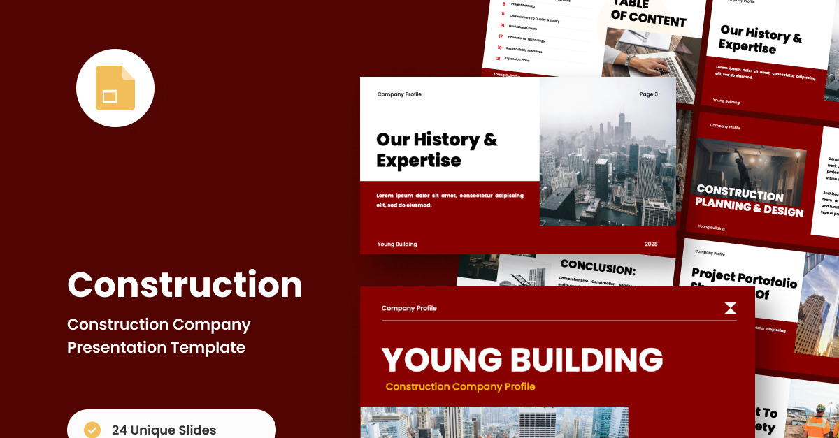 Una presentazione Google Slides ben strutturata, creata per aziende edili, società immobiliari e sviluppatori. Caratterizzata da un design minimalista ma di ispirazione industriale, questa presentazione accresce la credibilità professionale e la narrazione aziendale con immagini accattivanti e layout di facile lettura.
