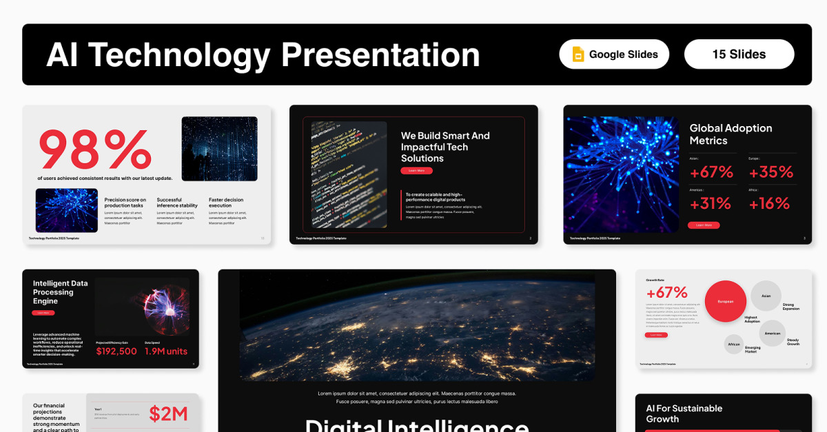 Tutte le slide sono completamente modificabili: personalizza colori, font, grafici, icone e immagini in base all'identità del tuo brand. Ideali per presentazioni di intelligenza artificiale, pitch tecnologici, demo di prodotto, report sull'innovazione, conferenze e riunioni con gli investitori.