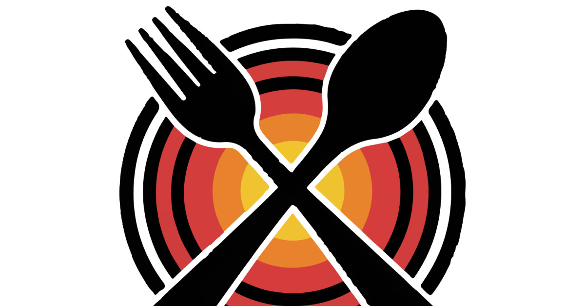 Un logo accattivante e vibrante per un marchio alimentare, caratterizzato da una forchetta e un cucchiaio stilizzati su un piatto