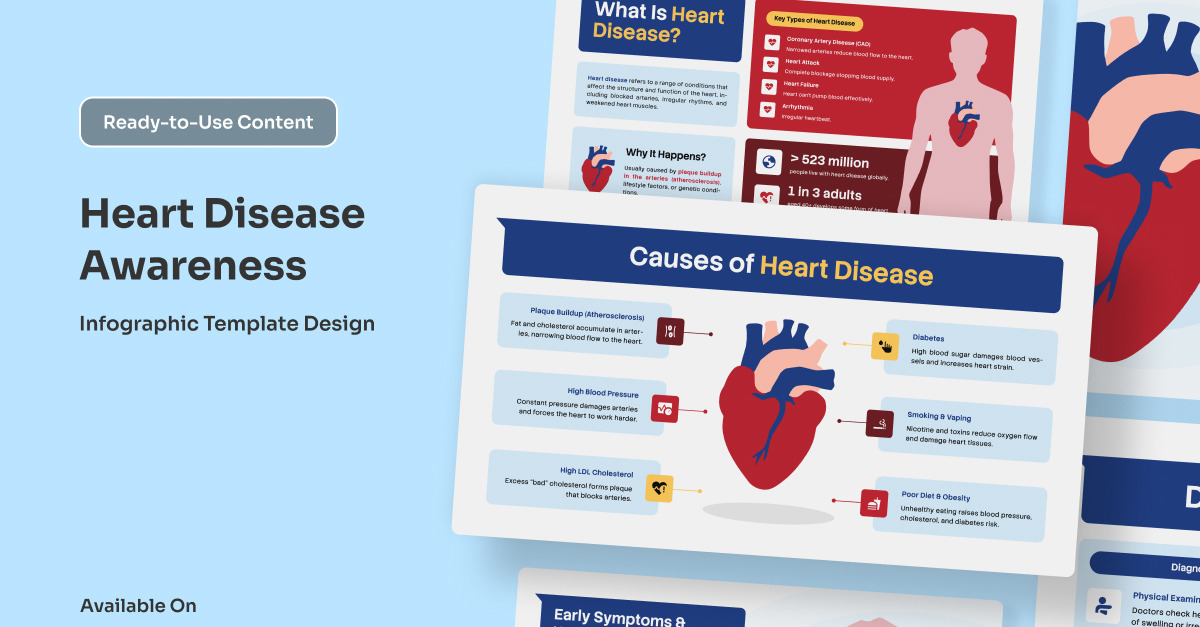 Creata con un approccio visivo incentrato sull'uomo, questa infografica supporta le iniziative di salute pubblica presentando informazioni relative alle malattie in una struttura calma, non intimidatoria e facile da seguire. Icone chiare, spaziatura equilibrata e toni morbidi, tipici delle linee mediche, contribuiscono a garantire che il messaggio sia accessibile a tutti i tipi di pubblico.