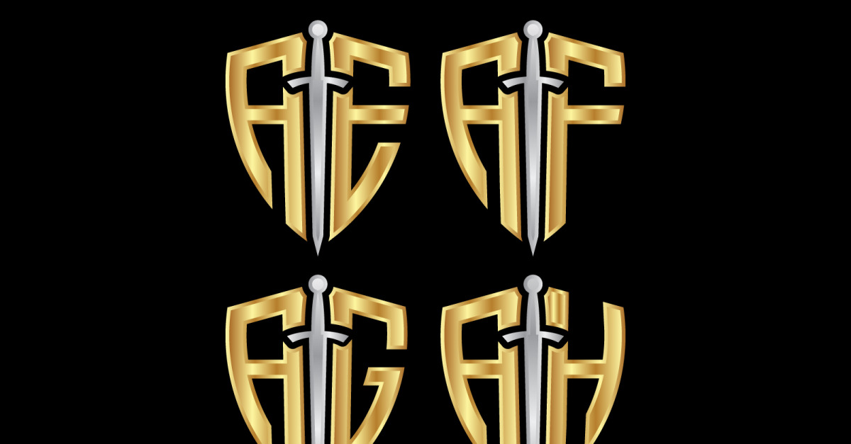 Logo gratuito con spada e scudo realizzato con le lettere iniziali AE, AF, AG, AH