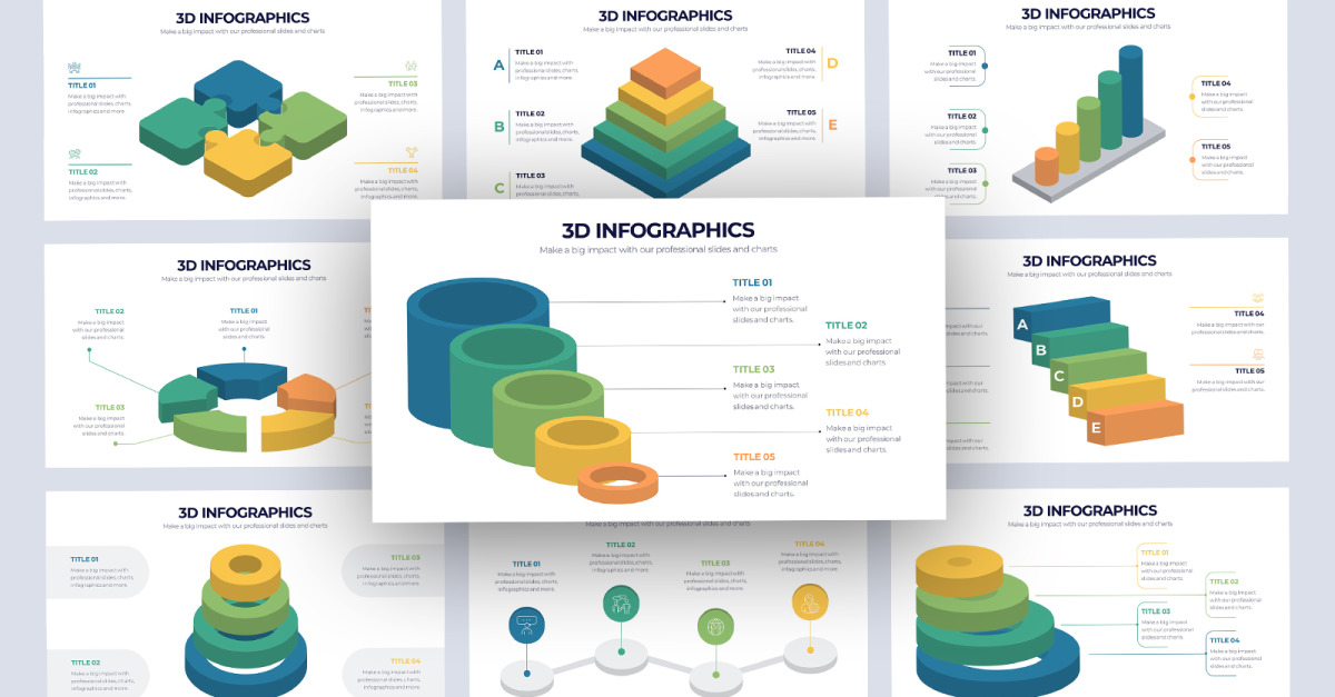 Modello di PowerPoint per infografica 3D Modello di presentazione piatto, pulito, minimalista, elegante e flessibile.